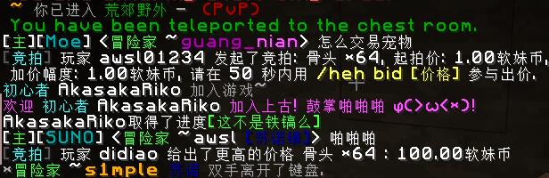 /heh auc [起拍价] [加价幅度] [保留价]拍卖手上的物品。 - 例如以底价 100 软妹币,每次抬价至少 10 软妹币拍卖附魔书,且希望至少拍到 150 软妹币才出售,则将要拍卖的附魔书拿在手上,输入