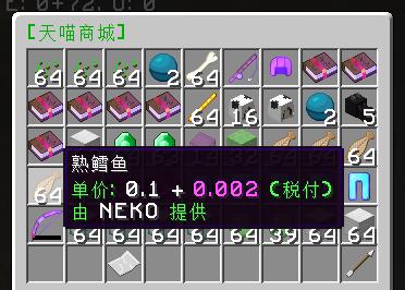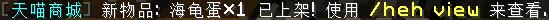 /heh view浏览天喵商城中的物品。左键点击购买一个,shift + 左键点击购买一格里的全部东西。