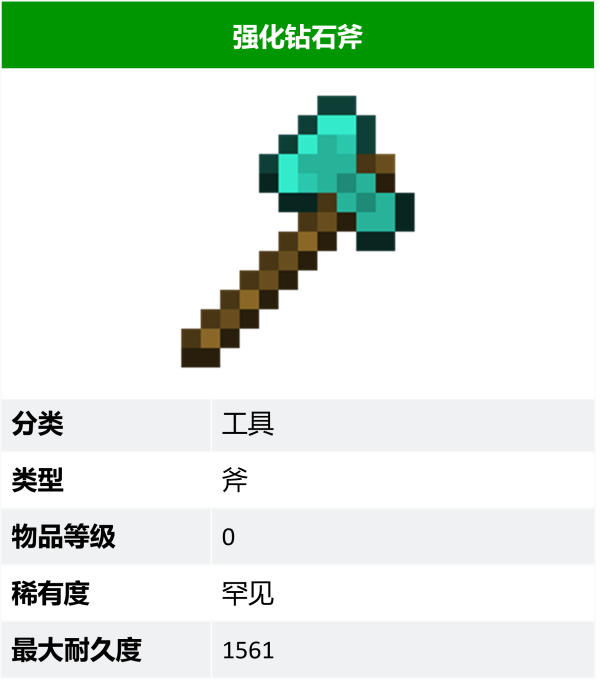 目录 强化钻石斧 介绍 武器属性 获得途径 强化钻石斧 介绍 用狼牙的粉末强化过的钻石斧,能够承受魔咒钻孔器的槽位追加效果。1) 武器属性 物品等级 0 效果 泛攻击力 8-10 暴击率 +3% 挖掘效率 +3 获得途径 通过在锻造台中用普通近战武器强化模板、狼牙强化钻石斧获得 可在游戏内通过图鉴查看 1) 该物品贴图会受资源包影响
