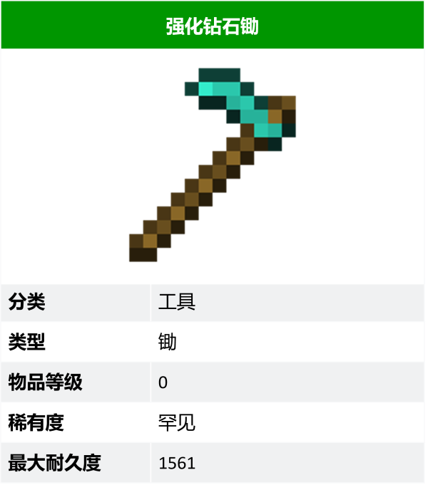 目录 强化钻石锄 介绍 武器属性 获得途径 强化钻石锄 介绍 用狼牙的粉末强化过的钻石锄,能够承受魔咒钻孔器的槽位追加效果。1) 武器属性 物品等级 0 效果 泛攻击力 3-5 挖掘效率 +3 获得途径 通过在锻造台中用普通近战武器强化模板、狼牙强化钻石锄获得 可在游戏内通过图鉴查看 1) 该物品贴图会受资源包影响