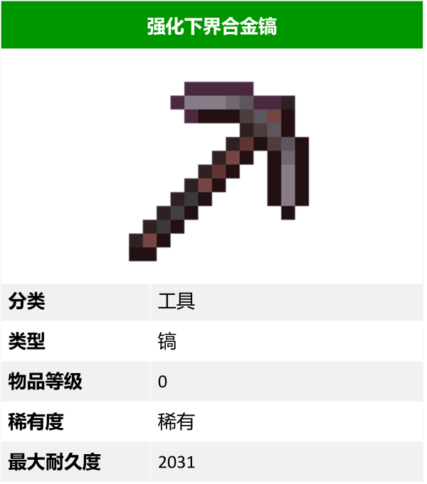 目录 强化下界合金镐 介绍 武器属性 获得途径 强化下界合金镐 介绍 由强化钻石镐升级而成的下界合金质装备,继承了其能够承受魔咒钻孔器的槽位追加效果的特征。用猪灵革强化下界合金镐也能获得同样的效果。1) 武器属性 物品等级 0 效果 泛攻击力 5-7 挖掘效率 +5 获得途径 通过在锻造台中用下界合金升级、下界合金锭升级强化钻石镐获得 通过在锻造台中用普通近战武器强化模板、猪灵革强化下界合金镐获得 可在游戏内通过图鉴查看 1) 该物品贴图会受资源包影响