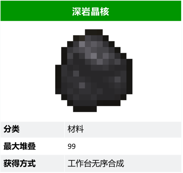 目录 深岩晶核 介绍 获得途径 用途 合成材料 锻造材料 材料 深岩晶核 介绍 自然教会常用的材料,看上去只是一块黑色的石头,但却硬度奇高,蕴含着对抗土的力量。 获得途径 通过圆石、深板岩、铁锭合成获得 可在游戏内通过图鉴查看 用途 合成材料 硬木护符 掘根铲 锻造材料 锻铁胸铠 铸铁面甲