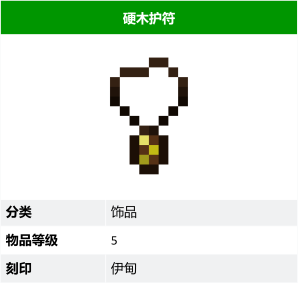 目录 硬木护符 介绍 饰品属性 获得途径 饰品, 伊甸 硬木护符 介绍 自然教会的标志饰品,蕴含有自然之神赐福,可以使佩戴者能够自由在林间穿梭。 饰品属性 物品等级 5 效果 安全摔落高度 +3 铭刻 伊甸 特殊效果 佩戴者可以获得二段跳的能力 获得途径 通过树心纤维、深岩晶核合成获得 可在游戏内通过图鉴查看