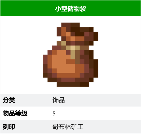 目录 小型储物袋 介绍 饰品属性 获得途径 饰品, 哥布林矿工 小型储物袋 介绍 某位天才冒险家融合了铭刻、自然神术和哥布林族群技术,将普通收纳袋改造而成的神奇储物道具。 饰品属性 物品等级 5 效果 挖掘效率 +5 铭刻 哥布林矿工 特殊效果 可容纳一组混合的物品 获得途径 通过线、皮革、树心纤维合成获得 可在游戏内通过图鉴查看