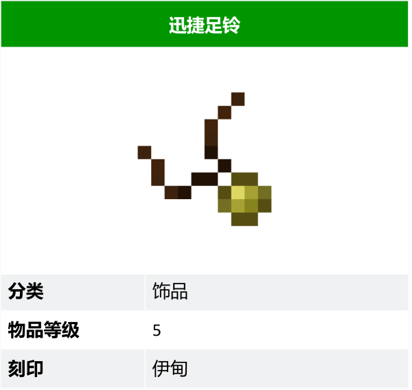 目录 迅捷足铃 介绍 饰品属性 获得途径 饰品, 伊甸 迅捷足铃 介绍 先知利用蕴含自然之神力量的材料制作出的神奇足铃,可以使佩戴者移动迅速。 饰品属性 物品等级 5 效果 移动速度 +5% 铭刻 伊甸 特殊效果 跃起落地后加速 获得途径 通过狼毫、狼牙、紫水晶碎片合成获得 可在游戏内通过图鉴查看