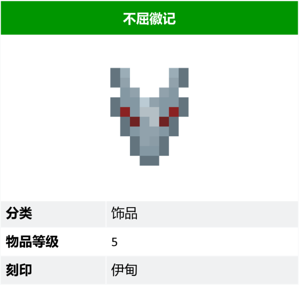 目录 不屈徽记 介绍 饰品属性 获得途径 饰品, 恐狼 不屈徽记 介绍 由伊甸恐狼之核简单加工而成的饰品,可以一定程度发挥核心中的灵魂力量。 饰品属性 物品等级 5 效果 击退抗性 +5% 暴击率 +3% 移动速度 +3% 铭刻 恐狼 特殊效果 低于 40% 血量时回复 5 血量并降低 10% 受到的伤害(持续 5 秒) 冷却时间 15秒 获得途径 通过狼毫、铁锭、伊甸恐狼之核合成获得 可在游戏内通过图鉴查看