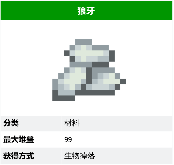 目录 狼牙 介绍 获得途径 用途 合成材料 锻造材料 材料 狼牙 介绍 虽然叫狼牙,但其实是某种蕴含特殊力量的骨质碎片,非常坚硬。可以用于强化钻石工具,使其能够承受魔咒钻孔器的槽位追加效果。似乎还能用于制作一些特殊道具。 获得途径 伊甸狼人掉落 用途 合成材料 迅捷足铃、伊甸恐狼徽记 锻造材料 用于强化钻石镐、钻石斧、钻石锄、钻石锹