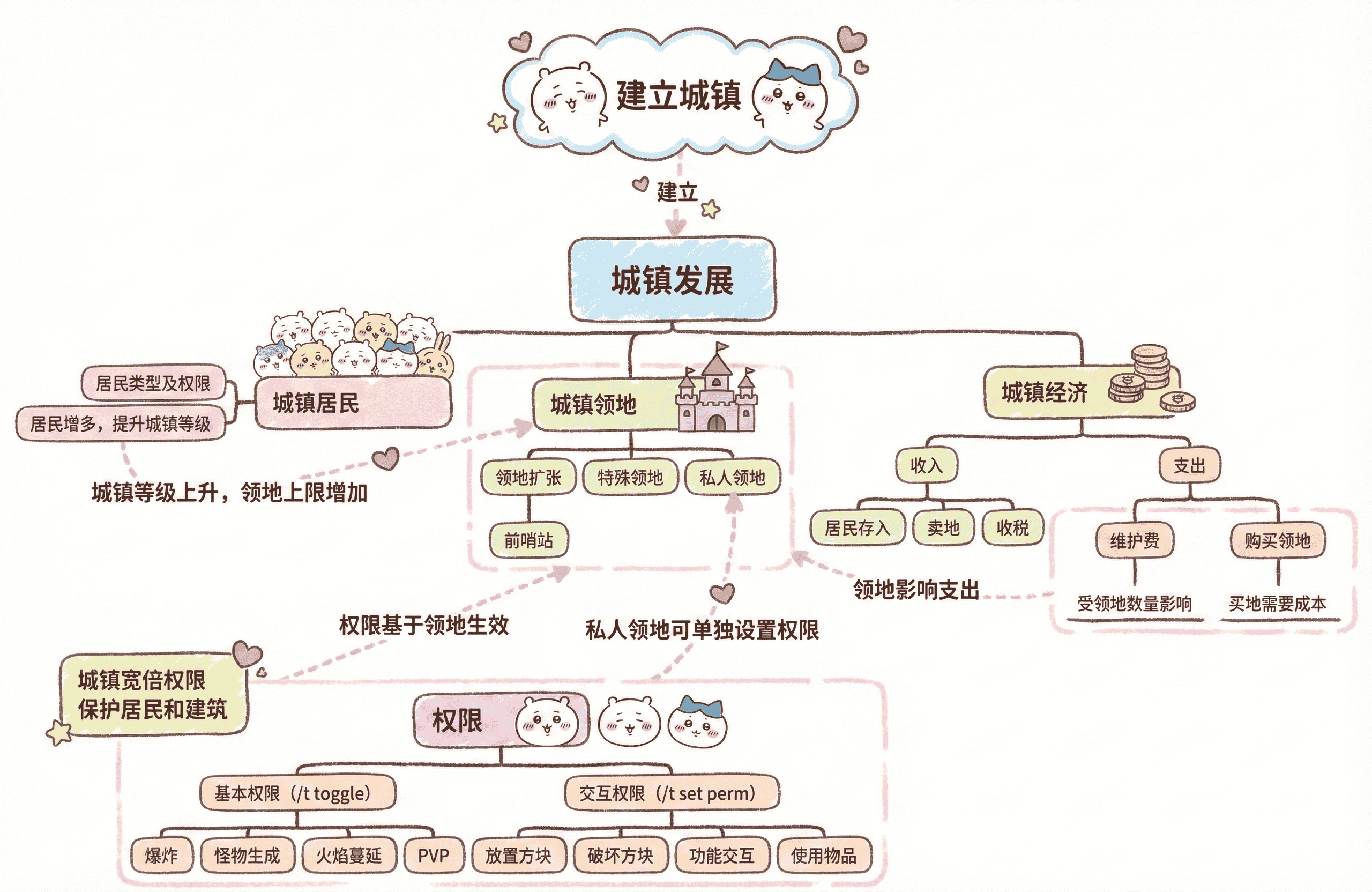 - 城镇的传送点必须位于市中心区块内。镇长可以使用 /t set spawn 设置传送点。