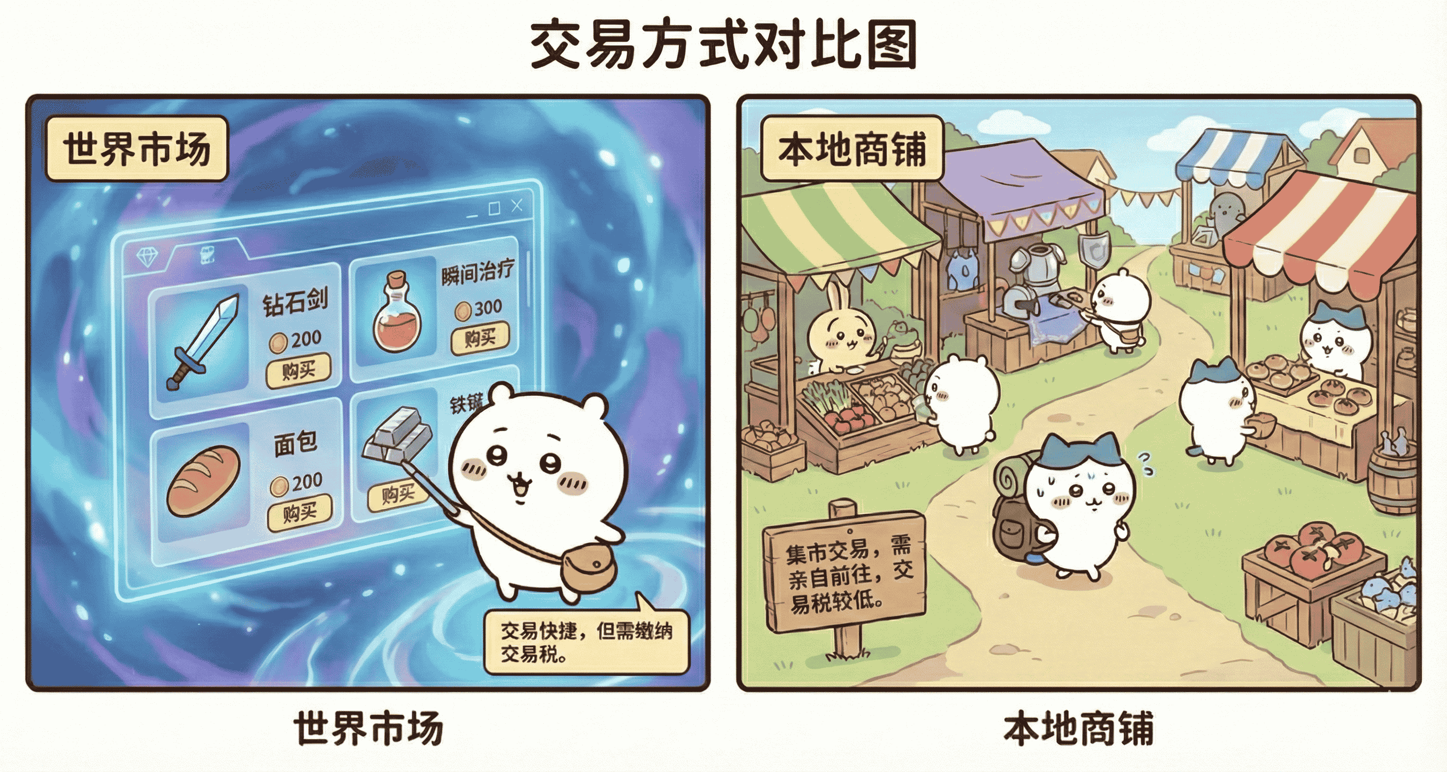 目录 市场/商铺 世界市场 本地商铺 市场/商铺 本词条将从 玩家间交易 的角度引导各位冒险家们如何参与经济活动。你将从本词条了解到 城镇生存 模式下现有的全球市场和本地商铺,让你能够借助庞大的市场来赚取硬币,或快速获得所需要的物品。 世界市场 世界市场是一个可以让交易 跨越时间与空间 发生的虚拟交易平台,有着出色的信息整合能力1)和物流输送机制2),但代价是相对高额的交易税。 → 阅读更多... 本地商铺 本地商铺的每一笔交易依赖实际存在的 物理媒介3)。看似操作更加麻烦,但这也意味着更低的交易税,更大的装饰空间,以及更好地与地理热点4)进行绑定。 → 阅读更多... 1) 所有人可以直接看到所有正在进行的交易 2) 所有物资和资金都可以瞬间完成转移,并且保证安全 3) 也就是说冒险者们需要先移动到一个店铺面前才能让交易发生 4) 如城镇中心、国家首都
