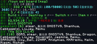 - board {信息} - 设置城镇公告,居民们登录游戏时都会看见