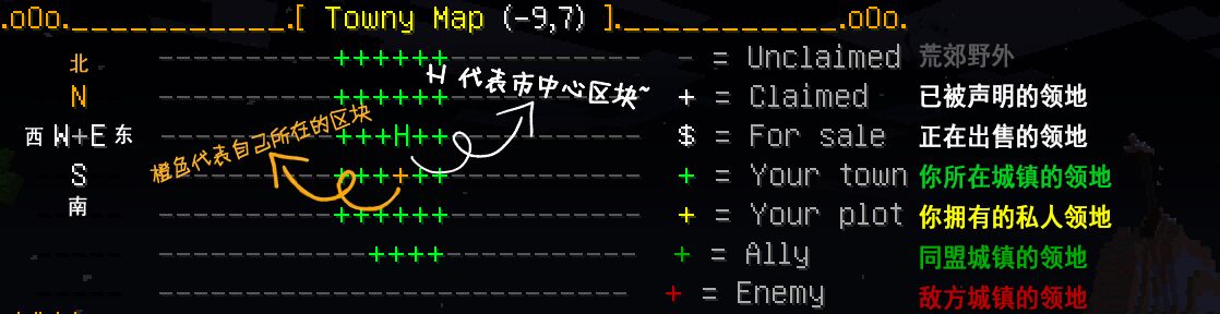 - {# (以当前坐标为中心的半径)} - 将半径范围内的所有区块声明为城镇领地